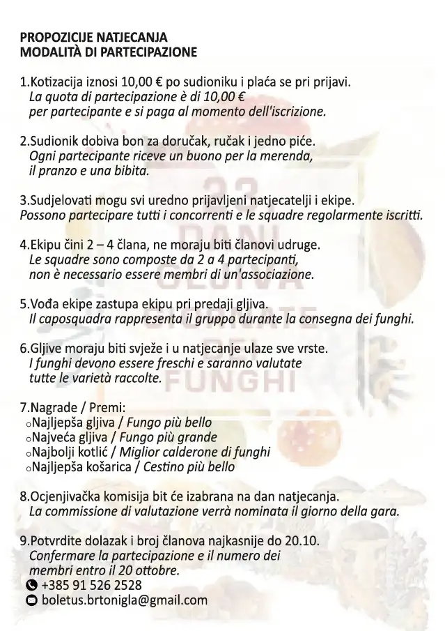 Također subotnje jutro posvećen je odlasku u šumu i takmičenja u branju gljiva, pronalasku najljepše i najveće gljive i popodnevno zajedničko druženje i glazbena animacija sastava „Malvazija band“.