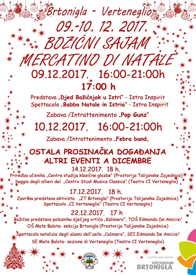9. i 10. prosinca održava se Božićni sajam koji Brtoniglu uvodi u blagdansku priču. Uz ukrase, unikatne ručne radove i aranžmane od borovine, u ponudi će se naći i domaće vino, rakije, med, sir, slastice i drugi autohtoni proizvodi već upakirani i spremni za poklon. Dok odrasli kupuju, najmlađi će u subotu uživati u predstavi Djeda Mraza. Uz glazbeni program Febra i Pop Gunz bandova neizostavni su domaći specijaliteti i kuhano vino. Otkrijte i ostala prosinačka događanja!