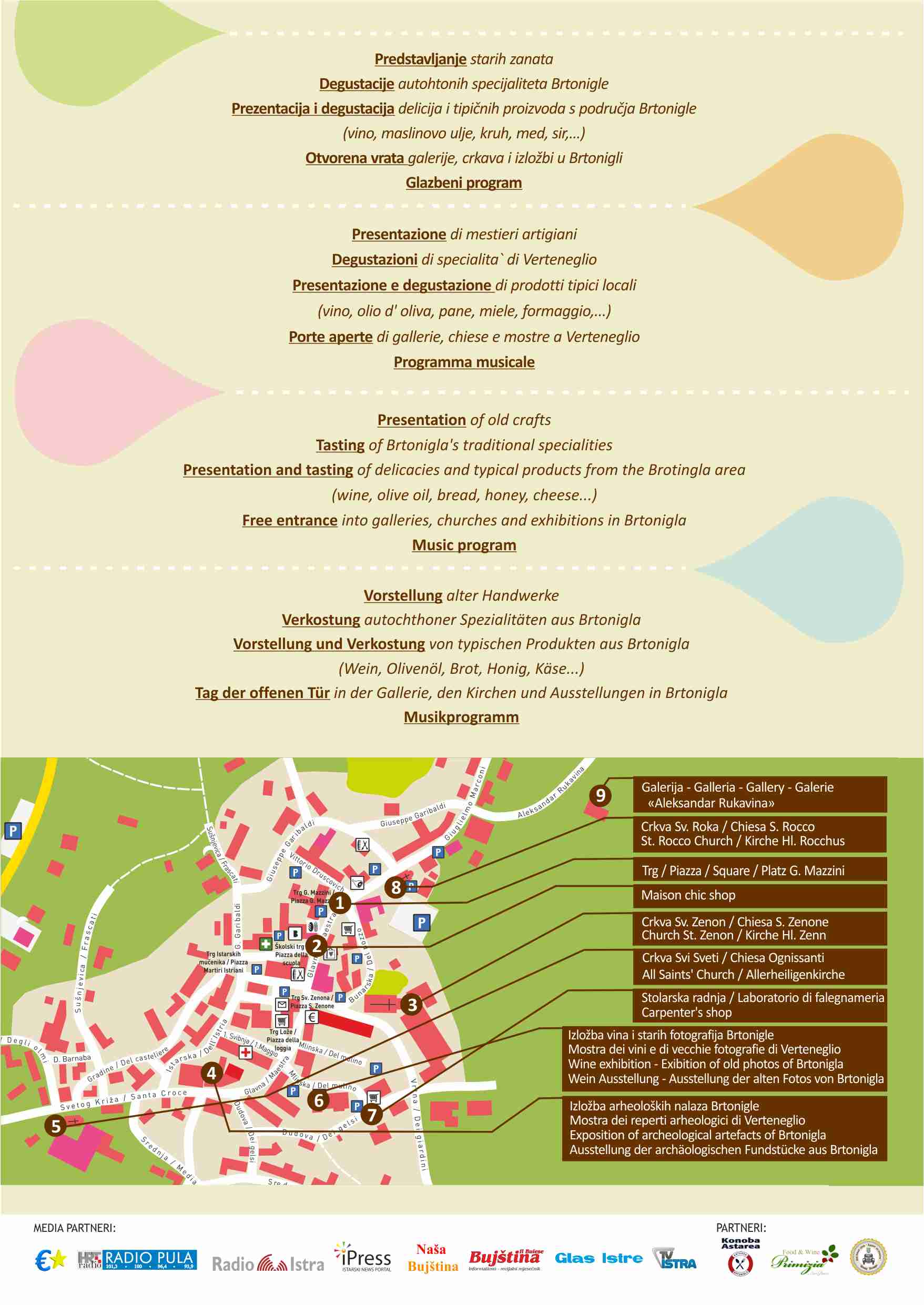 Manifestacija će vam pružiti priliku da osjetite prošlost kroz stare zanate. Vrijedni članovi Udruge zanata Maison chic predstavit će kako su nekad radili istarski nonići. Tako ćete moći pogledati kako su radili kamenoklesci, upoznati način izrade abat jour-a za lampe, osjetiti svojim rukama oblikovanje glinenog posuđa ili posjetiti stolarsku radionicu te ostale zanimljivosti u sklopu manifestacije. Na malenom trgu Mazzini moći ćete uživati gledajući umijeća izrade autohtonih rukotvorina. Svaki gost dobit će malu mapu s istaknutim lokalitetima u Brtonigli gdje se radionice nalaze, a nova malo izmijenjena mapa se nalazi u privitku ove objave.