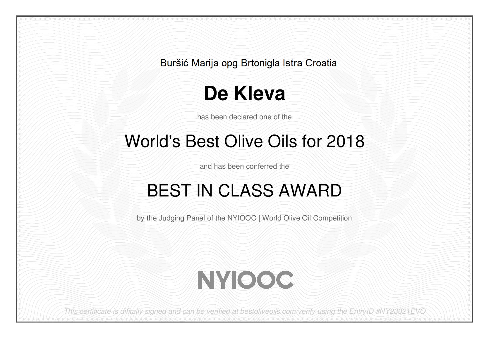 Na najvećoj svjetskoj smotri maslinovih ulja, šestom po redu Međunarodnom natjecanju maslinovih ulja u New Yorku, koje se održalo u četvrtak 26. travnja 2018. godine, Hrvatska su ulja osvojila sveukupno 40 medalja, a među njima poseban su uspjeh postigla ulja De Kleva OPG-a Marija Buršić za blend DE KLEVA i Bembo OPG-a Lupić, koji su proglašeni BEST IN CLASS, najboljima u svojoj klasi.