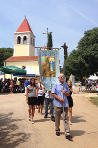 Nedjeljni program nastavljen je Svetom Misom, koju je predvodio don Marčelo Lakošeljac, uz nastup crkvenih zborova iz Brtonigle, Nove Vasi i Lovrečice, te tradicionalnom procesijom kroz Radine nakon koje je uslijedila degustacija domaćih kolača vrijednih domaćica iz Radina te zabavna tombola. Vrijednost i tradiciju ove male vjersko-pučke fešte potvrđuje i pismo upućeno mještanima Radina od strane gđe. Elene Radin, s prebivalištem u Australiji, ali čiji su roditelji porijeklom iz ovih krajeva. Upravo je njezin tata Stelio Radin, rodom iz Radina, prenosio svoja sjećanja na ovo mjesto, običaje, tradiciju i lokalne stanovnike, čime je bila potaknuta zahvaliti se u svoje i ime roditelja na predivne uspomene te čestitati stanovnicima Radina njihov dan i feštu Gospe Lurdske, uz posebnu zahvalu gđi. Mariji Radin i ostalim stanovnicima na održavanju male mjesne crkvice.
