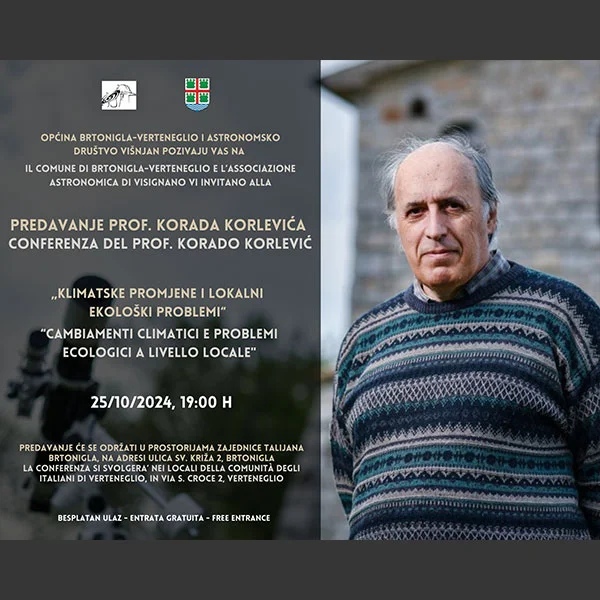 Il Comune di Brtonigla-Verteneglio e l'Associazione Astronomica di Visignano vi invitano alla conferenza del prof. Korado Korlević intitolata „Cambiamenti climatici e problemi ecologici a livello locale“, che si terrà il 25 ottobre 2024 con inizio alle ore 19:00.