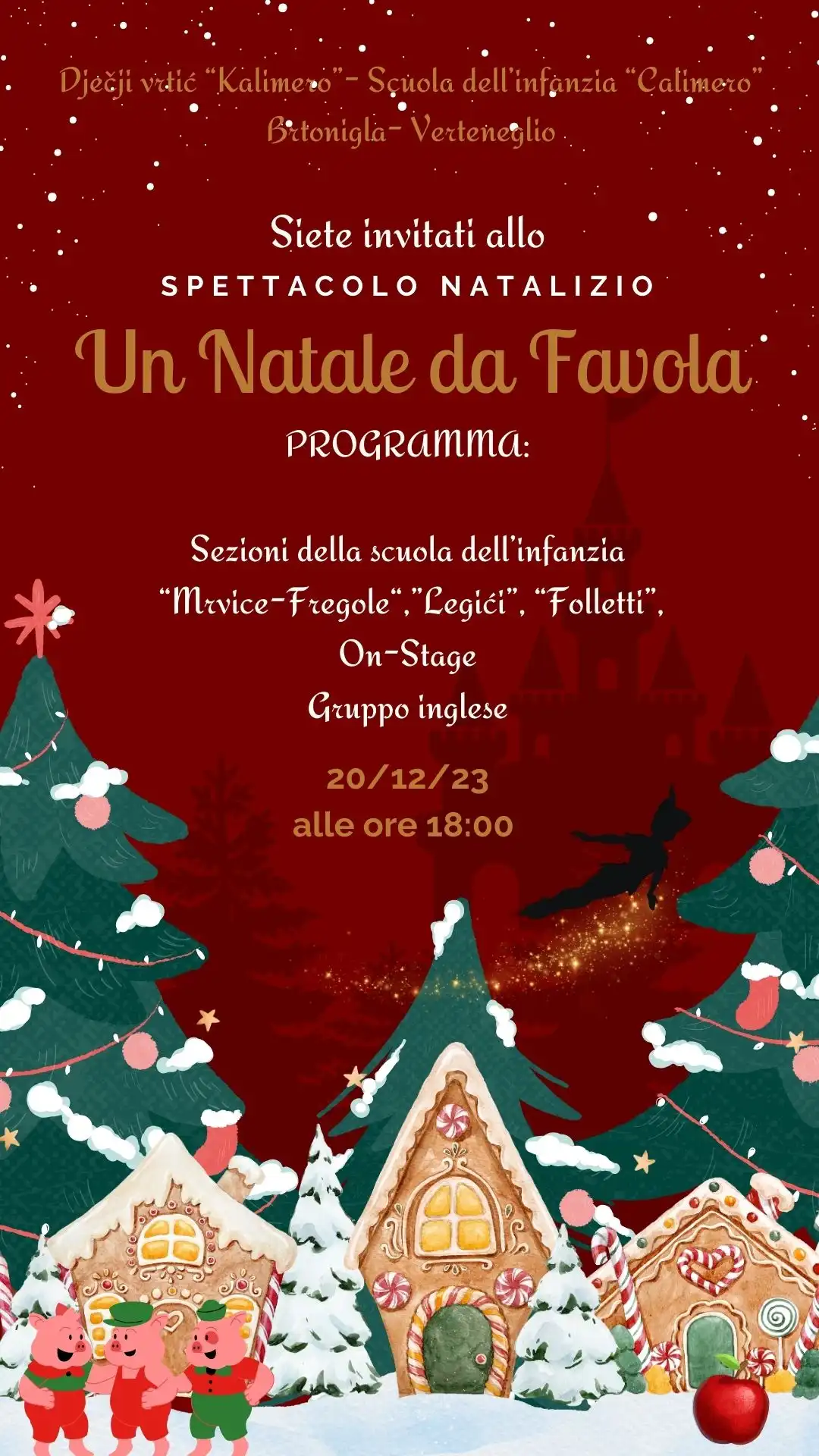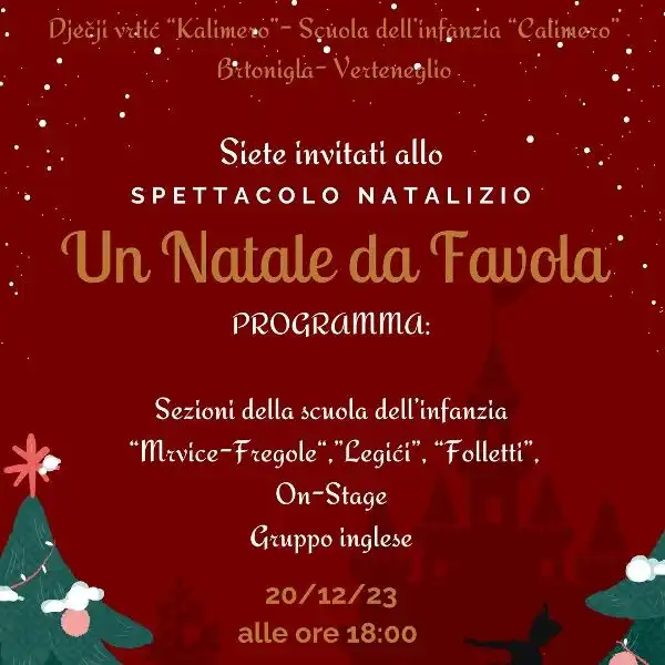 Inoltre, la Scuola dell'infanzia „Calimero“- Dječji vrtić „Kalimero“- Brtonigla- Verteneglio, Vi invita alla recita natalizia „Un Natale da favola“, che si terrà il 20/12/2023 alle ore 18:00.